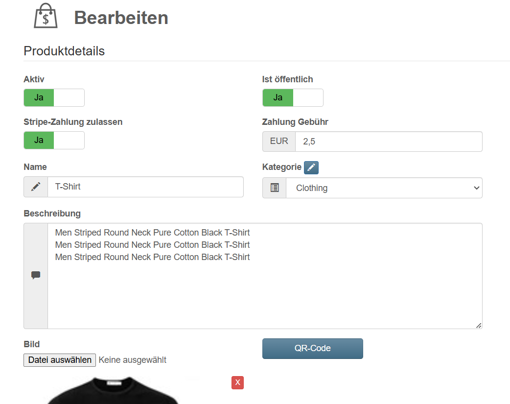 - Der Benutzer kann Produkte direkt per Stripe oder per SEPA-Mandat kaufen.
