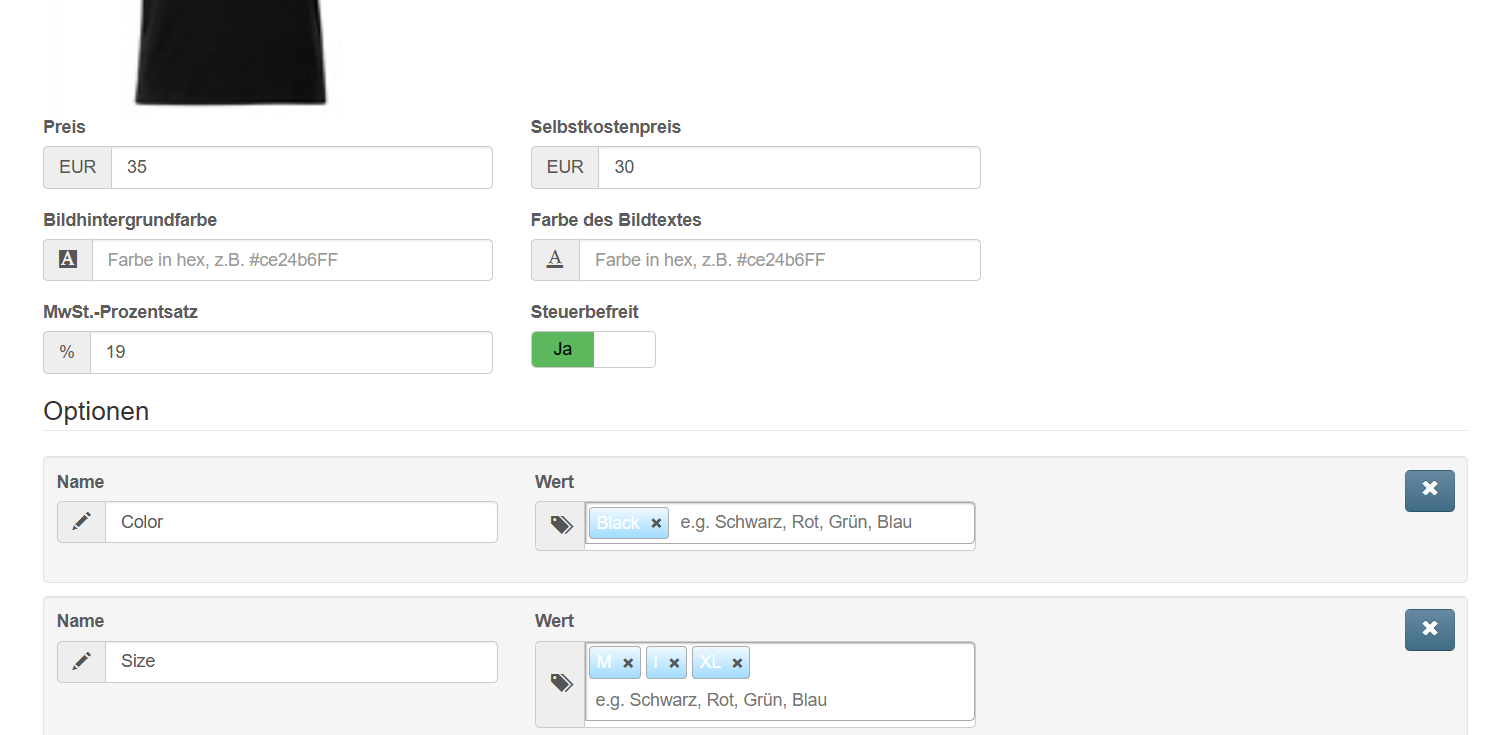 Bearbeitung von Produktdetails und Sichtbarkeit.